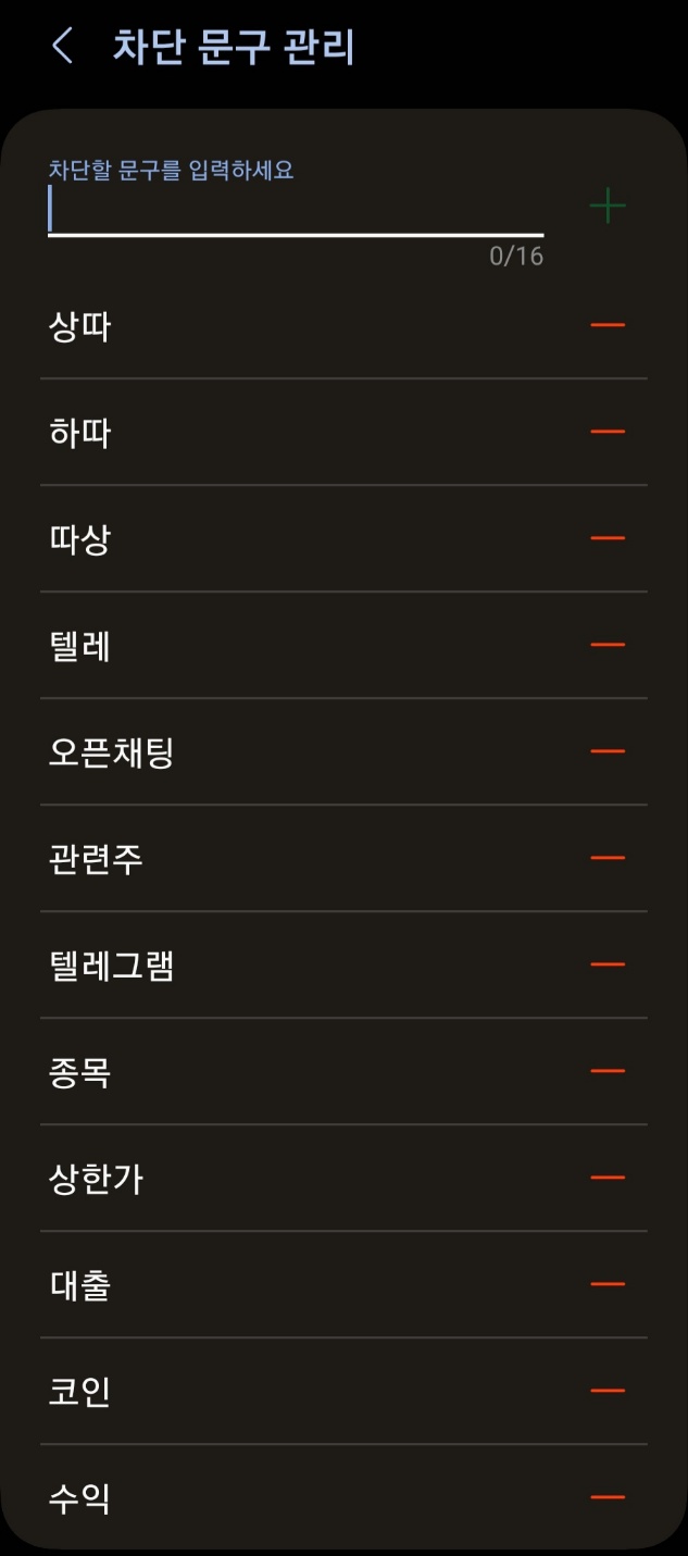 그리고 마지막으로 차단 문구 관리에서 자주오는 스팸 메시지 문구를 등록해주면 됩니다.