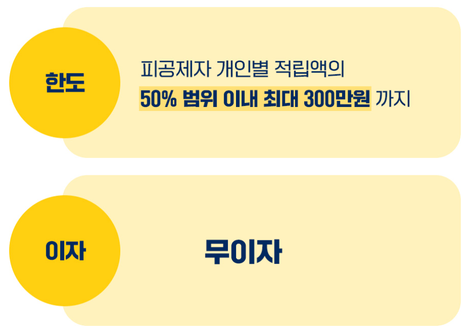 개인별 적립금액의 50% 이내로 최대 300만 원까지 무이자로 시행하고 있습니다.