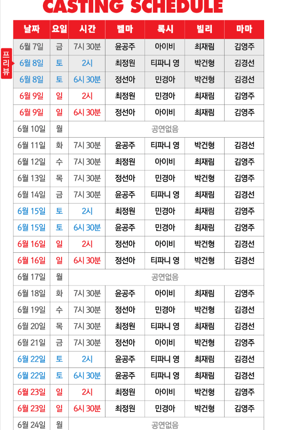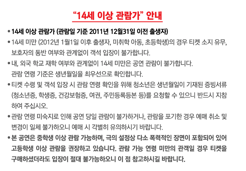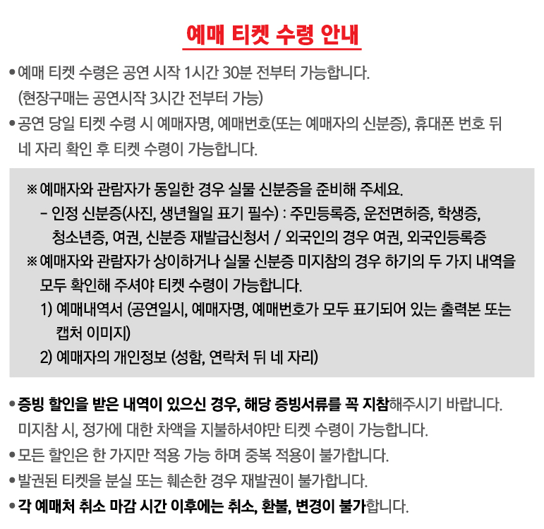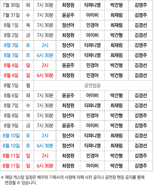 - 공연 시간 : 화~금 오후 7시 30분 / 토 ~일 오후 2시, 오후 6시 30분 / 월요일 공연 없음