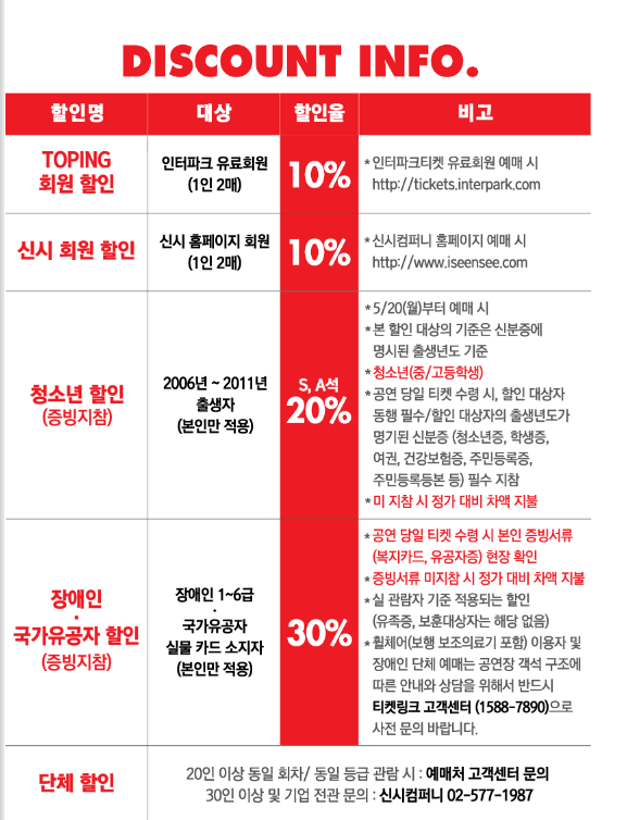 1인 최대 2매까지 예매 할수있으며 인터파크나 주최사 홈페이지 예매시 10% 할인혜택을 받을 수 있습니다.