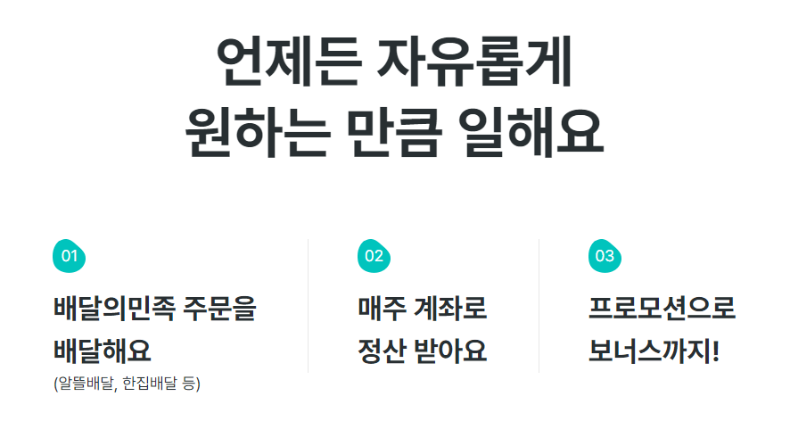 도보, 자전거, 오토바이, 자동차등 자신에게 맞는 수단을 이용해 부담 없이 배달이 가능하며 원하는 시간에 자유롭게 배달을 할 수 있어 가볍게 부업으로 접근하기 알맞습니다.