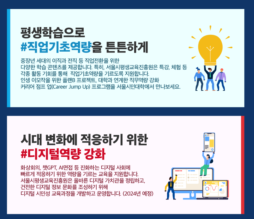 중장년층의 이직이나 창업 등 다양한 직무 교육 컨텐츠를 제공합니다.