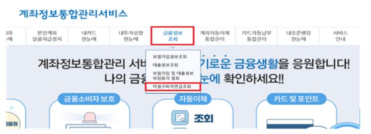 1. 계좌정보통합관리서비스 홈페이지 접속 후 미청규 퇴직연금 조회클릭