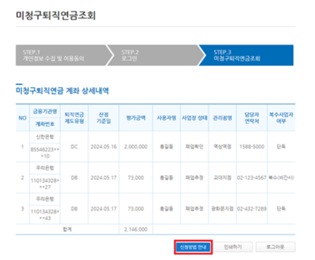 4. 미청구 퇴직연금 수령 신청 방법 확인 완료후 수령하기