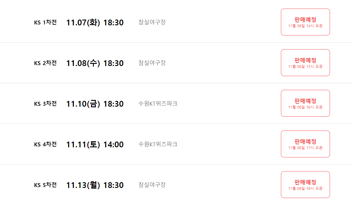 우선 5차전까지 11월6일(월)에 오후 2시부터 오후 6시까지 예매 할수있고 나머지 6차전과 7차전은 추후 예매가능합니다.