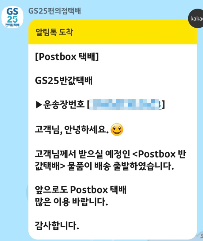 gs편의점 택배에서 발송인이 물건을 발송하게 되면 수령인의 카카오톡으로 운송장번호가 오게 되는데 아래를 통해 운송장번호를 확인하여 배송조회를 하면 물건의 위치를 확인할 수 있습니다.